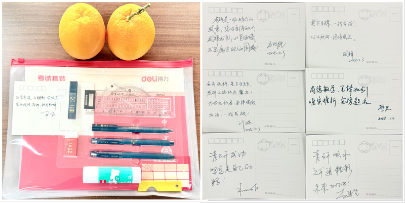 随后,与会领导老师们为学子分发精心筹备的考研慰问包。慰问包内含实用文具与能量零食,承载着学院心想事“橙”的美好祝愿,让学子深切感受到关怀与温暖。