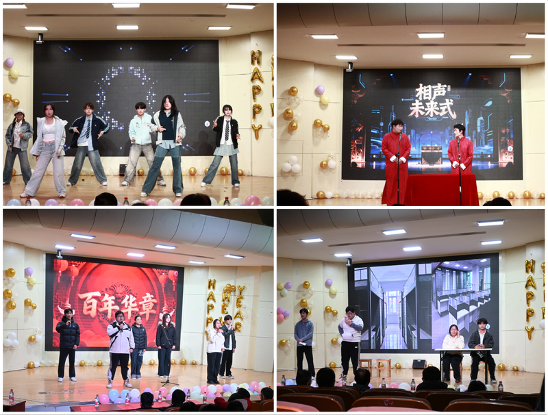 伴随着阵阵欢声笑语,晚会正式拉开帷幕。节目形式多样、精彩纷呈:相声《学生时代》以幽默诙谐的演绎再现校园生活的温馨点滴,《相声未来式》则以轻松明快的风格畅想科技发展与未来图景;朗诵《百年华章》气势恢宏,字里行间彰显新时代青年的责任担当;舞蹈《Drama》活力迸发,瞬间点燃全场热情;《如果我变成回忆》《一笑倾城》《如果可以》《青花》四首歌曲风格各异,尽展多元音乐魅力;舞蹈《神女劈观》巧妙融合传统韵味与现代动感,偶像练习生舞蹈串烧则尽显青春朝气;小品《诈诈诈,我诈你》以寓教于乐的方式普及反诈知识,传递正能量。晚会在全场师生齐唱《仰望星空》的温馨氛围中圆满落幕。