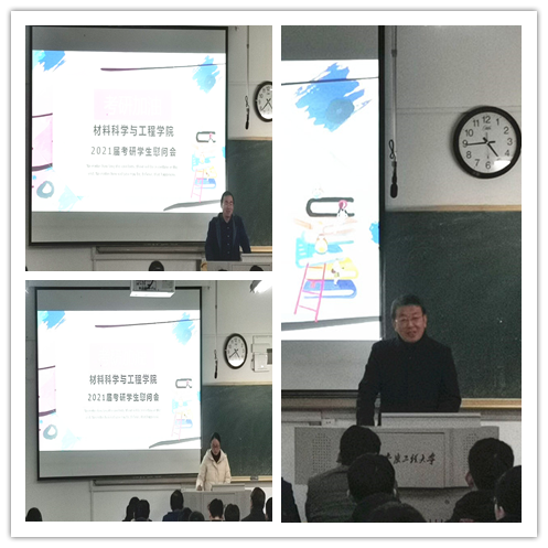 学院党委书记王勇智做最后总结,他首先代表学院对同学们积极备战考研的辛苦表示支持和鼓励,表达了学院全体师生对大家的关心关爱。他强调作为材料学院第一批考研学生,承载着学院的希望,全体考生要严肃态度,做到诚信考试;要有顽强拼搏的精神,坚持不懈,不到最后一刻坚决不放弃;最后,他寄语同学们,作为新时代的青年大学生,要敢于筑梦,勤于追梦,勇于圆梦!