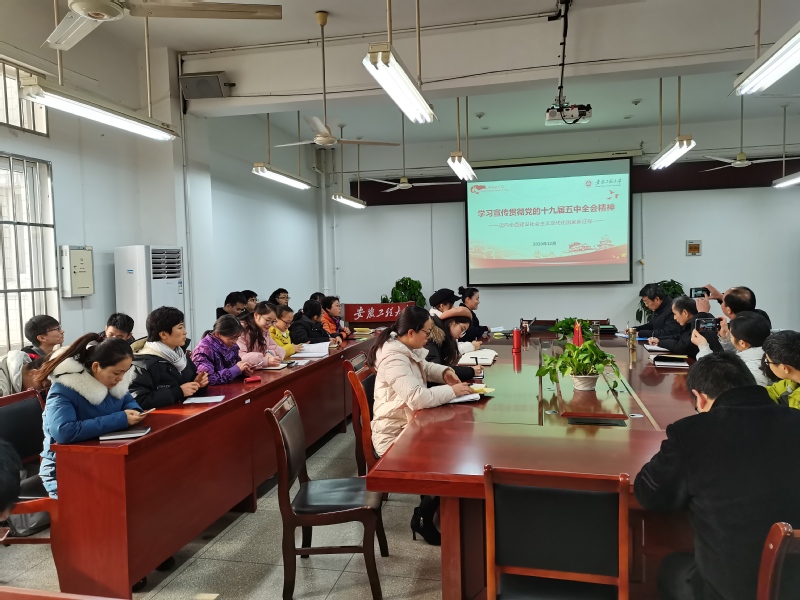12月16日下午, 亚洲色图 在216会议室组织全体教职工和新发展党员共同学习党的十九届五中全会精神。本次学习会特邀马克思主义学院院长吴月红教授进行专题宣讲,学院党委书记王勇智主持学习会。