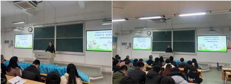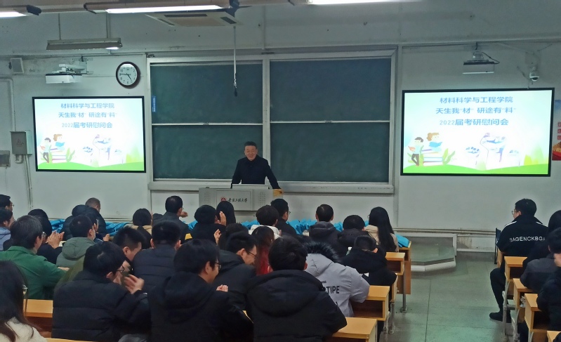 为鼓励2022届材料学院考研学生坚持不懈,自信迎考,12月9日下午, 亚洲色图 在2J206举行天生我“材”,研途有“料”--2022届考研学生慰问会。学院党委书记王勇智、院长左如忠、副院长朱协彬和刘琪、教师支部书记和系负责人、团委书记以及毕业班辅导员参加慰问活动。活动由院长左如忠主持。