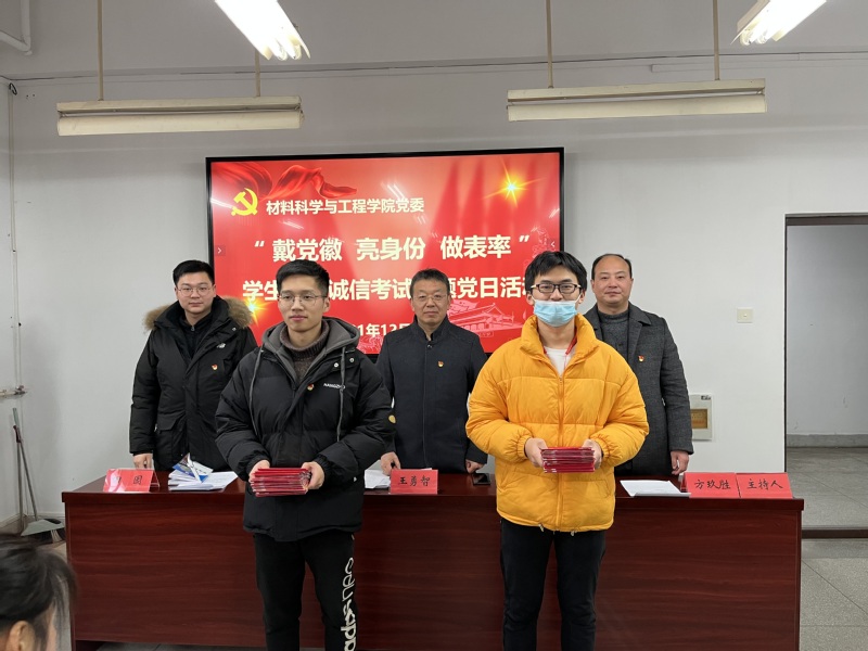 为进一步落实立德树人根本任务,强化党支部的战斗堡垒作用,充分发挥学生党员“五带头”作用,进一步加强学风、考风建设,12月28日下午,材料学院在B203报告厅举办“戴党徽、亮身份、做表率”学生党员诚信考试主题党日活动。学院党委书记王勇智出席活动并讲话,全体学生党员参加。活动由院党委副书记方玖胜主持。
