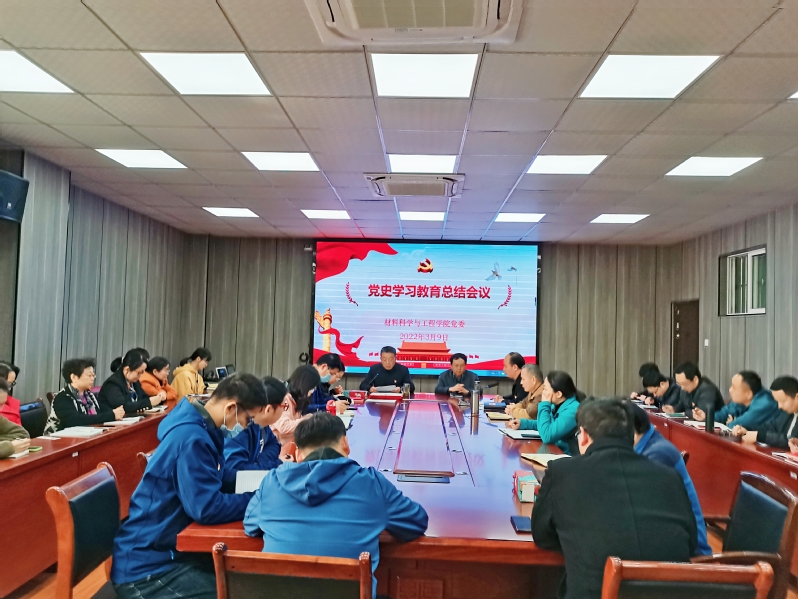 材料学院党委书记王勇智从加强组织领导、强化任务落实、打造特色亮点等三个方面全面总结一年来学院党史学习教育开展情况和取得的成效,分析了党史学习教育中存在的不足,并提出下一步工作思路。他要求,学院全体党员干部和师生员工要强化政治建设,落实政治责任;聚焦初心使命,落实根本任务;坚守为民情怀,持续为民服务;坚持从严从实,推进从严治党。要持续强化理论武装,不断巩固拓展学习教育成果,切实把党史学习教育成效转化为实际行动,为推动学校高质量发展贡献力量,以优异成绩迎接党的二十大胜利召开!