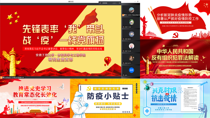 为进一步提升学生党支部的组织力和青春活力,发挥学生党员的先锋模范作用,材料学院研究生党支部结合当前实际,于4月23日开展“先锋表率‘我’带头,战‘疫’一线党旗扬”的主题党日活动。本次活动分为线上集中理论学习和线下志愿服务活动两个部分,除研究生支部全体党员参加外,还邀请了部分发展对象、入党积极分子和群众代表参加,组建成一支“防疫知识宣传”志愿服务队。