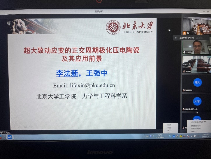 报告会上,李法新作题为《超大致动应变的正交周期极化压电陶瓷及其应用前景》的学术报告。分享了其课题组采用周期正交极化(POP)新方法,通过引入界面应力调控铁弹畴翻转,成功在PZT压电陶瓷中获得近0.6%的局部超大致动应变;以此制成的多层压电陶瓷致动器,可输出超过0.5%的均匀应变,具有很高的循环稳定性,并可以实现对BT陶瓷的介电性能和单晶硅的半导特性的有效调控。