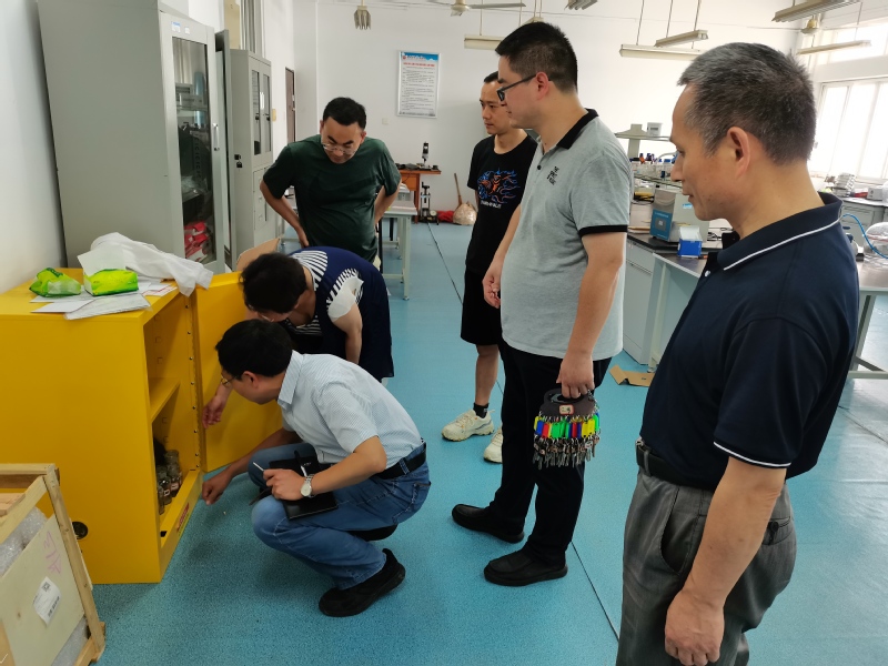 检查组重点检查了有色金属省重点实验室和化学实验室。除了对用电安全、消防安全、实验室安全管理制度、整洁卫生等进行了常规检查,特别对金属粉末的采购、存放、使用进行严格细致的检查。期间,左如忠亲自清点防爆柜中存储的活性金属粉末的数量,并要求实验室负责人严格按照学校规定限量领用、合理分类存储。随后,检查组成员认真检查了化学实验室的高压气瓶、废液处置、药品分类存放、试剂标签粘贴、设备合理摆放等情况,并再三强调使用规范,确保实验室安全。另外,在先进陶瓷研究中心实验室,检查组成员对设备用电安全、操作规程上墙、安全警示标志、实验室整洁等情况,进行详细检查,并不时提醒相关负责人,注意操作规程,严防疏漏。