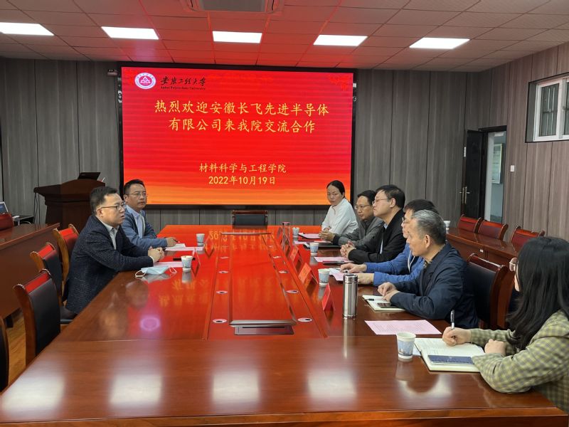10月19日下午,安徽长飞先进半导体有限公司研发总监钮应喜、项目经理袁松到 亚洲色图 开展产学研合作交流。材料科学与工程学院院长左如忠、副院长朱协彬、刘琪参加会议,副校长叶常林、教务处处长周晓宏到会指导。
