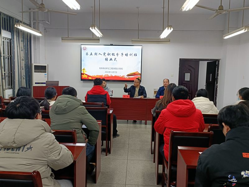 12月7日下午, 亚洲色图 第五期入党积极分子培训班结业式在B203举行。院党委书记郭广春出席结业式并讲话,入党积极分子培训班班主任鲁力和全体学员参加仪式,结业式由院党委副书记方玖胜主持。