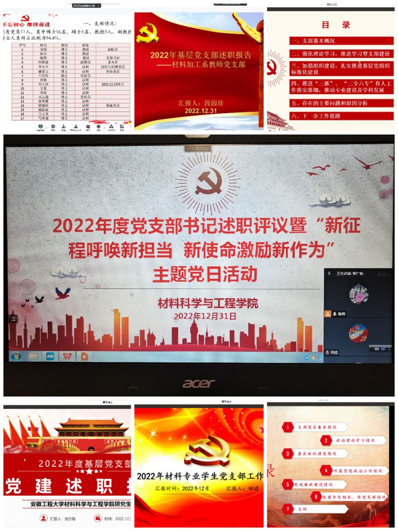 材科系教师党支部书记陶锋、材加系教师党支部书记段园培、材控专业学生党支部书记陈希、材科专业学生党支部组织委员兼纪检委员鲁力、研究生党支部书记刘方瑜对照《中国共产党支部工作条例(试行)》等党内法规制度,对标党中央决策部署和上级有关工作要求,围绕认真贯彻新时代党的建设总要求,结合学校“三抓”和“三全六专”工作要求,依次通过线上形式PPT汇报2022年度履职情况、工作成绩和主要特色,反思了工作中存在的问题,并结合支部自身建设情况提出了下一步工作思路。