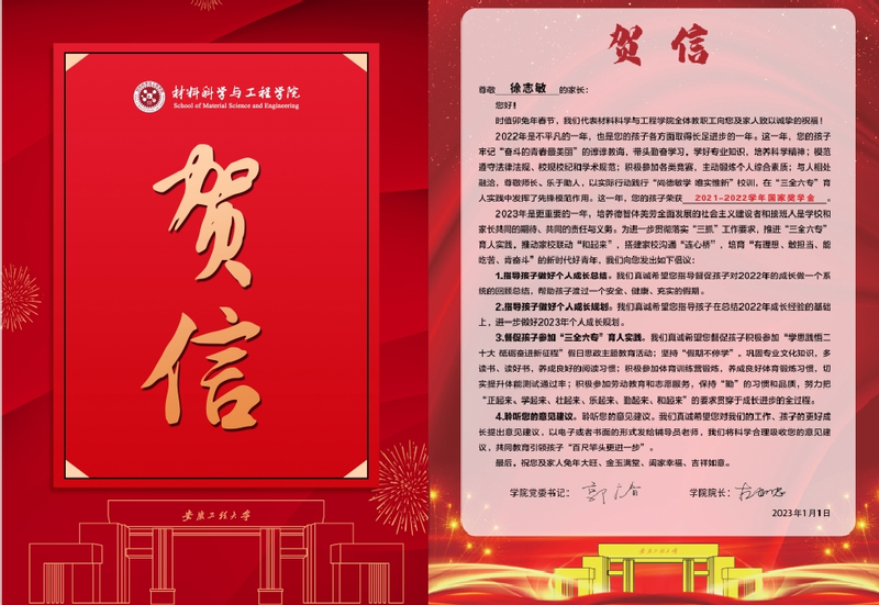 据悉,为了推进家校共建,营造“和起来”的育人实践氛围, 亚洲色图 专门策划了“给学生家长的一封贺信”活动,详细介绍了学生在校期间的思想动态、获奖情况以及学校的育人政策等,倡议家长在假期指导孩子做好人生规划和总结、督促他们参加“三全六专”育人实践,邀请学生家长积极参与到学院发展建设和育人实践各项工作中,共同做好人才培养工作,促进学生德智体美劳全面发展。