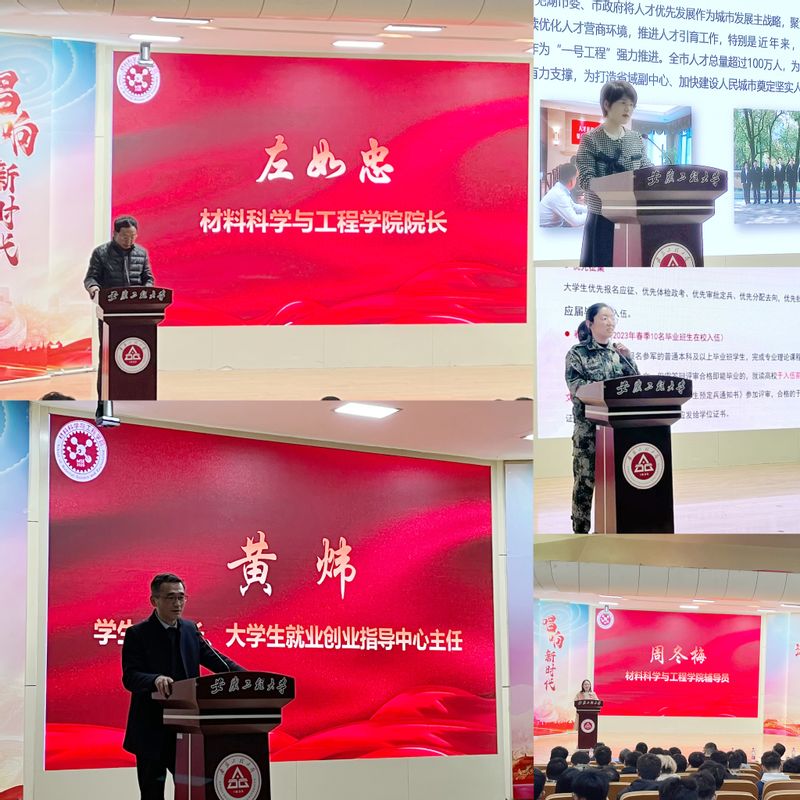 在就业政策宣讲环节,院长左如忠代表学院致辞,简要介绍学校发展情况、学院发展历程、专业建设情况和人才培养的基本做法,希望全体毕业生转变就业观念,主动就业、尽快就业,以实际行动投入到祖国建设发展中去;希望芜湖市人才发展集团、与会企业更多选择并向其它优质企业推荐学院毕业生。毕业班辅导员周冬梅从“专业领域宽、综合素质高、思想素质好”等三个方面介绍2023届本科毕业生发展情况、个性特点、就业情况,并以表格的形式逐一展示未就业毕业生求职意愿。宋丽丽详细解读“紫云英人才计划”政策内容、芜湖市材料行业企业发展情况,呼吁学院2023届毕业生留在芜湖就业创业。黄炜用“好工作是干出来的,不是找出来的、不怕起点低,就怕无成长、不要用你的现在去判断你的未来、要读书就读到底、不是所有人都一定要去读研究生、参军入伍也是一种好的选择”六句话,引用工作中的具体案例对毕业生就业进行指导。赵成靖从国家政策、经济待遇、个人发展三个方面介绍参军入伍政策。
