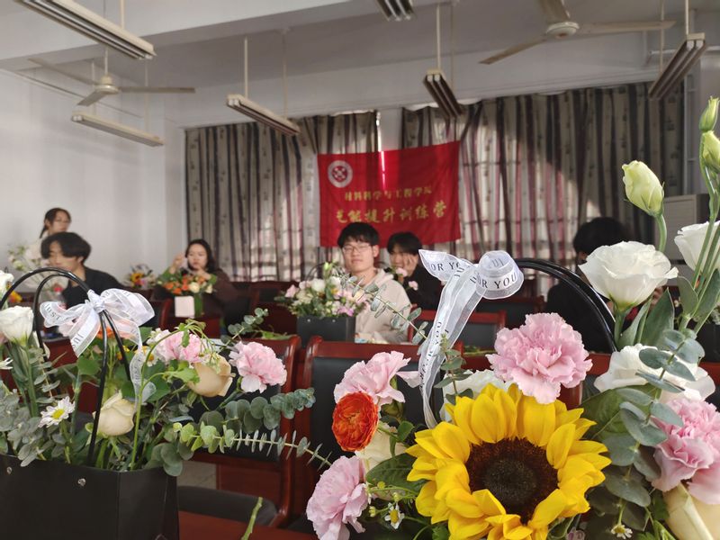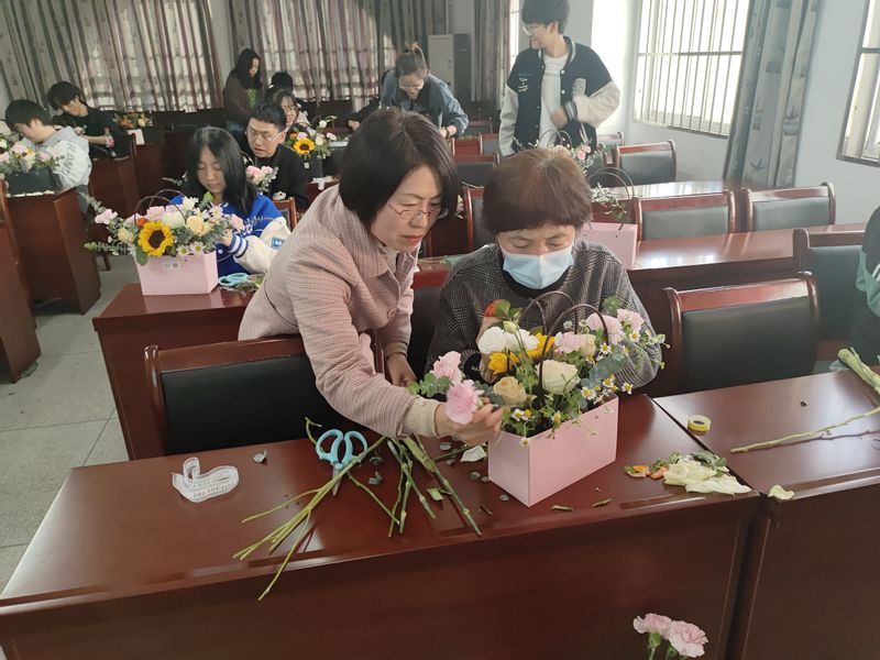 张玉凤详细介绍不同类别鲜花的花语、寓意,一对一指导同学们动手实践完成一件插花艺术作品,并相互展示和交流。