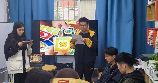 本期训练营以介绍国内外多人线下活动为主题,由聂静怡,周德岩两位主持人首先讲解卡牌游戏uno,并用流利的英语说明了游戏规则。接着同学们分别分享自己喜欢的线下活动,如国际象棋、围棋、跳棋等等。