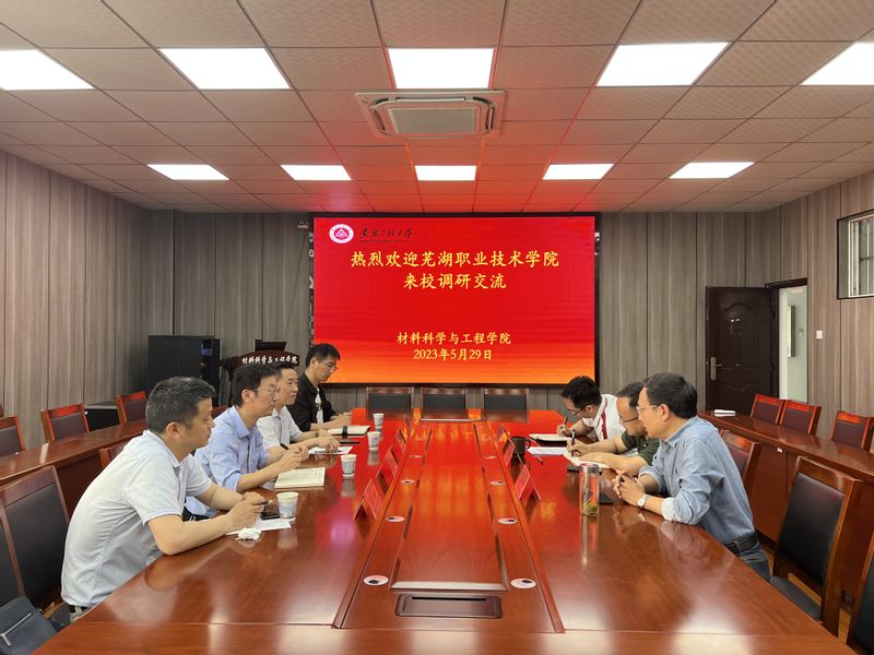 5月29日,芜湖职业技术学院党委委员、宣传部长曾友山、材料工程学院院长吴为亚一行来 亚洲色图 调研交流,在B座216会议室举行座谈会。 亚洲色图 党委书记郭广春、院长左如忠、副院长陶锋参加了座谈会。会议由郭广春主持。