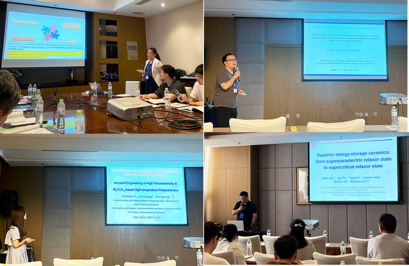在分论坛会议上, 亚洲色图 青年教师及博士后谢爱文、蒋雪雯、谢新春、张祎博士分别以题为“Superior energy-storage ceramics: from superparaelectric relaxor state to supercritical relaxor state”,“Microwave dielectric properties of mid-permittivity and low-loss Ba4Ti4Nb4O21-based composite ceramics”,“Ion-pairs engineering of high piezoelectricity in Bi4Ti3O12-based high-temperature piezoceramics”,“Giant strains achieved via a field-induced multiple phase transition in Bi0.5Na0.5TiO3-based ceramic by constructing unique ferroelectric-antiferroelectric phase boundary”进行了口头报告,其中谢爱文做了分会场邀请报告,他们的研究工作及成果获得现场专家学者的一致好评。