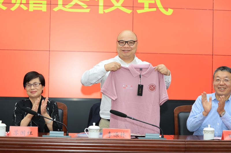 苏国红为李源林赠送一件印有院徽和李源林校友学号的定制院服,希望校友事业蒸蒸日上、时刻不忘母校培育之恩。