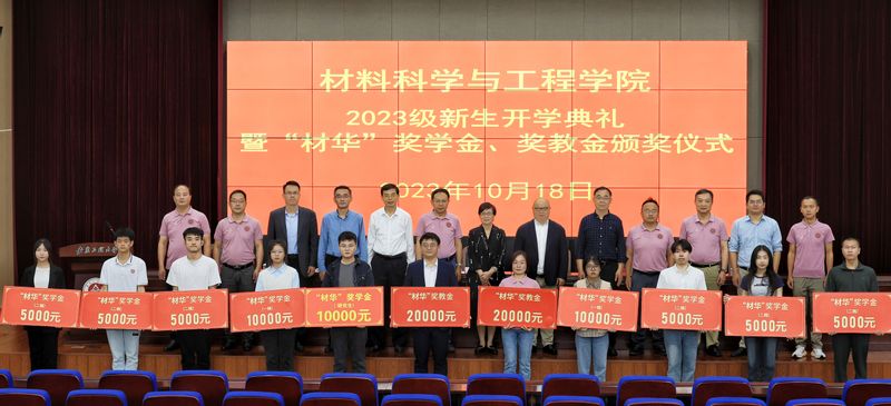 10月18日, 亚洲色图 2023级新生开学典礼暨“材华”奖学金、奖教金颁奖仪式在图书综合楼五楼会议室举行。校党委副书记、校友会会长苏国红,2006届校友、“材华”奖学金、奖教金捐赠人、琥崧科技集团股份有限公司董事长李源林先生,以及社会合作处、研究生部、学生处等职能部门负责人、教学科研关系在学院的相关职能部门负责人、2023级学生家长代表等应邀出席。学院党政班子成员、全体教师、2023级全体本科生和研究生参加典礼仪式。典礼仪式由学院党委书记郭广春主持。