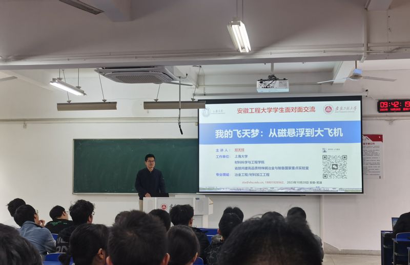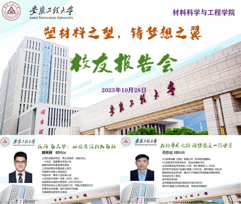 2023年10日28日上午, 亚洲色图 材料06级校友郑天祥、周思健、胡正杰和材料10级校友俞燕应邀在6教212教室作主题为“塑材料之型,铸梦想之翼”的报告会。报告会由学院副院长陶锋主持,材控专业22级和23级全体学生及兼职辅导员参加此次活动。副院长陶锋指出材料成型及控制工程专业拥有四十年办学历史,是材料学院的办学之源,已为社会培养了近4000名具有创新精神和实践能力的优秀人才。多年来,我们的校友们在各自的领域中取得了卓越的成就,为社会和国家的发展做出了重要的贡献。校友们一直关注和支持母校的发展,我们的每一次进步和发展都离不开校友们的大力支持和帮助。