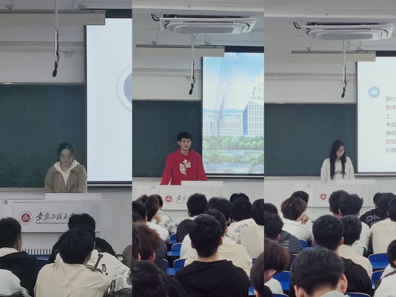 第二场讲座是由谈雨欣、丁艺、汪玉婷三位优秀学生代表分别分享自己的大学规划和经验建议。材控201班心理委员谈⾬欣,她向大一新生们分享自己的大学每个阶段的具体规划和详细做法,满满的“⼲货”,为⼤⼀新⽣们指明道路。材科212班学习委员汪⽟婷,她从课程学习、学⽣活动和课余⽣活三个⽅⾯分享⾃⼰的⼤学规划,建议大家要懂得劳逸结合,在搞好学习基础上,多丰富课余⽣活,其中着重强调要培养良好的学习习惯,积极参加活动和社会实践。院学⽣会执⾏主席丁艺,他通过一个个重要学生干部经历,分享大学成长的六条建议:克服恐惧,勇于尝试;具有集体荣誉感;果断坚毅,雷厉风行;有爱心,有责任担当;参加实践,历练自我;艰苦奋斗,自力更生。