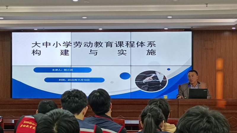 仪式结束后,贾文友、胡小波分别以《夯实做强学校劳动教育实践特色品牌》、《大中小学劳动教育课程体系构建与实施》为题,为劳动教育先锋示范班学员讲授生动形象的劳动教育课。贾文友从劳动教育知识全覆盖、劳动教育实践树品牌、劳动教育课程建体系、劳动教育研究有成果等方面鼓励劳动教育先锋示范班夯实、做强学校劳动教育实践特色品牌;胡小波从培养目标、劳动领域与途径、文化内涵等三个方面介绍了设计完善劳动教育课程体系的方法。