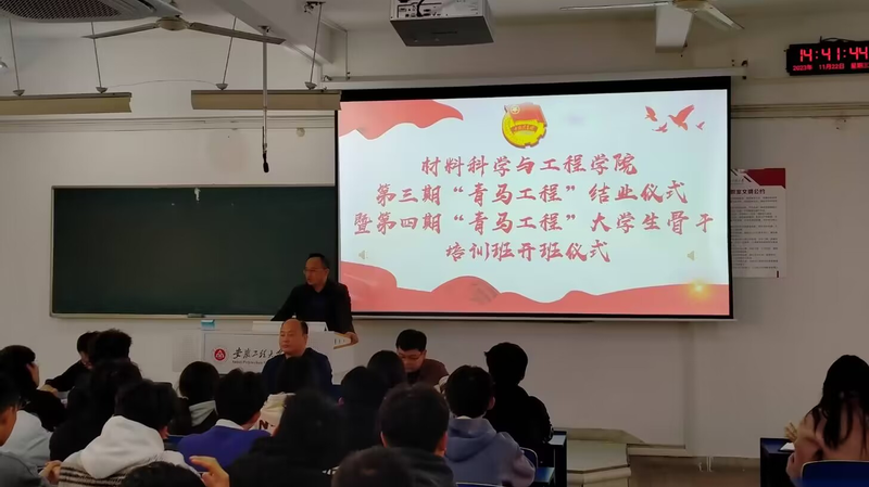为深入学习贯彻习近平新时代中国特色社会主义思想、党的二十大精神和团十九大精神,11月22日下午, 亚洲色图 在6教213举办院“青马工程”第四期大学生骨干培训班开班仪式,院党委书记郭广春、党委副书记方玖胜、团委书记陶冶、团委教师兼职副书记田园以及全体第三期、第四期青马班学员参加仪式。仪式由陶冶主持。