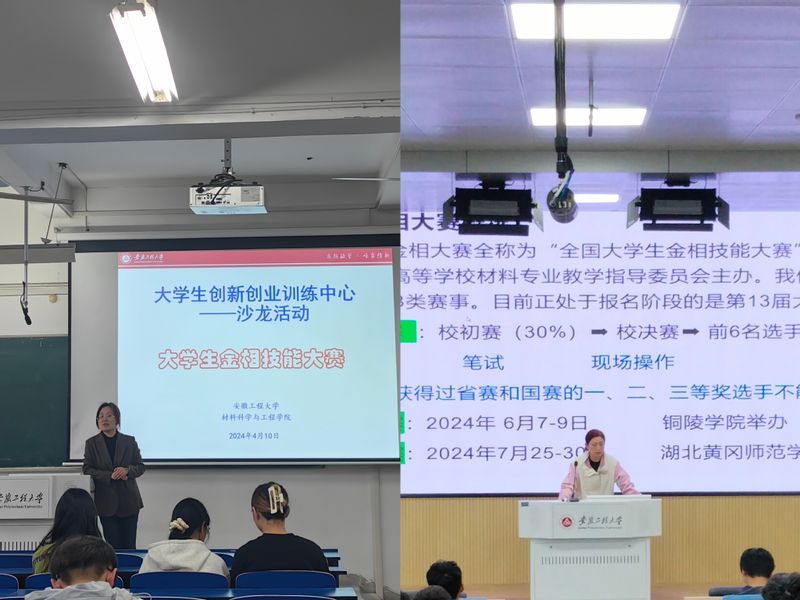 4月10日下午, 亚洲色图 在5教217教室、6教211教室分别举办了大学生金相技能大赛动员培训大会。学院大学生创新创业训练中心主任陈静、实验中心老师刘明朗、本科生辅导员周冬梅同全体2022级、2023级学生一起参加了此次活动。
