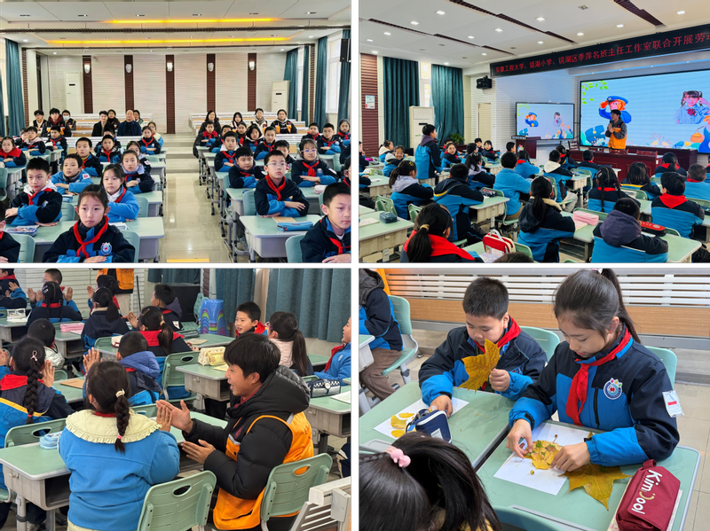 劳动教育先锋示范班班长侯睿祺为四年级学生上了一堂《劳动最光荣》的微课堂。他从劳动的由来及意义、近代劳动者、辛勤的劳动者、我是小小劳动者、劳动名言及歌曲等方面生动形象地讲述了劳动的基本知识,介绍了如何力所能及的帮助父母做一些力所能及的小家务,用简单的小游戏激发同学们对劳动的思考。此外示范班成员还带着小朋友们体验落叶作画,现场欢声笑语。