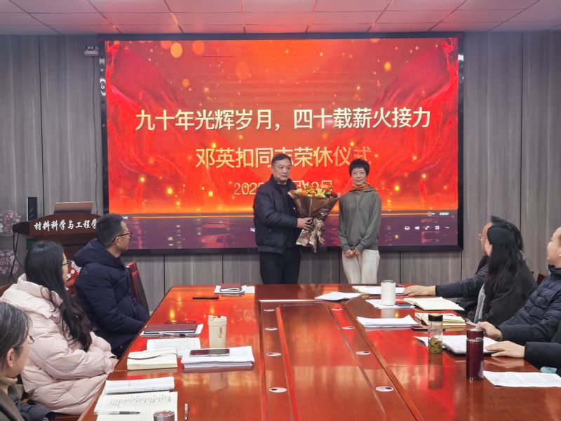 学院党委副书记、工会主席方玖胜,组织员陈希,材料加工系党支部书记、系主任段园培分别向邓英扣赠送纪念品、送上鲜花和诚挚祝福。