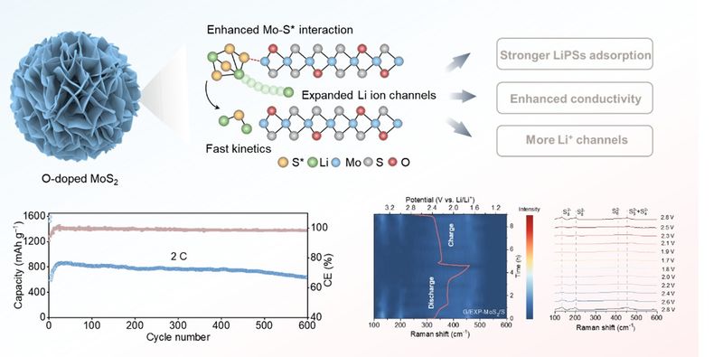 锂硫电池因其超高能量密度,被视为下一代高性能储能系统的重要候选者。然而,多硫化物转化动力学迟滞所引发的穿梭效应,严重制约了其实际应用前景。针对这一挑战,该研究团队通过分子工程策略,开发了一种氧掺杂MoS2(E-MoS2)催化剂,以加速多硫化物转化动力学。氧掺杂引入缺陷,激活MoS2惰性基面,同时诱导层间库仑排斥作用,使(002)晶面间距从 0.63 nm 扩展至 0.95 nm,在提升催化活性边缘位点利用率的同时,创造额外的锂离子扩散通道。此外,该策略优化了Mo的3d 轨道电子结构,促进 1T 相富集,提高材料导电性,并强化多硫化物吸附与电荷转移。实验表明,E-MoS2负载的锂硫电池即便在高硫负载和贫电解液条件下,仍展现出优异的比容量与循环稳定性。这一研究成果为锂硫电池的高性能催化材料设计提供了新思路,有望推动其在实际储能系统中的应用。