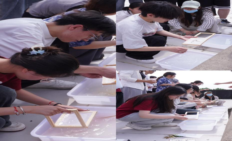 理论学习后,实践环节在阳台展开。同学们分组体验“抄纸-浇纸-晒纸” 流程,将苔藓、蕨类、花瓣等自然素材嵌入纸浆,创作 “植物标本宣纸”。清水拂过竹帘的沙沙声中,一张张融合春天气息的个性化宣纸逐渐成型。“原来造纸不是简单的‘搅拌’,力度和角度都会影响纸张的质感!”2023 级学生李雨桐捧着自己制作的花草宣纸感慨道。
