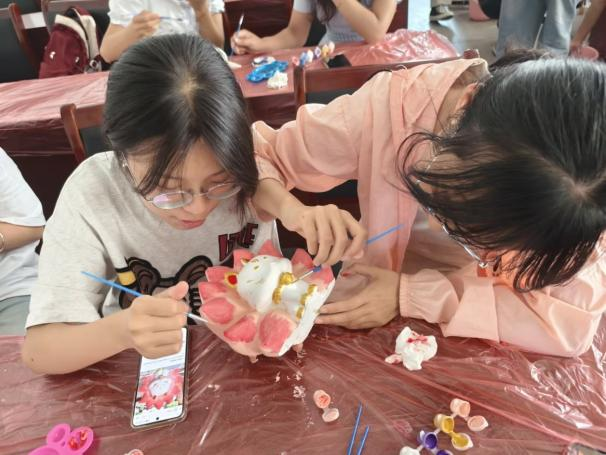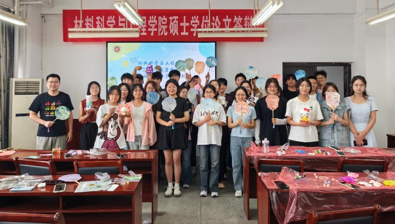 活动分为陶瓷娃娃彩绘和漆扇制作两个环节。在陶瓷娃娃创作环节,学生们以白色素胚为画布,用五彩颜料勾勒出笑脸、星空、向日葵等意象,表达对生活的热爱与对自我的关怀。新能源材料241付红艳表示:“绘制过程中,我感受到久违的专注与放松。”漆扇制作则充满传统美学韵味。师生们将天然大漆与金粉、贝壳片等材料结合,在扇面上创作出流动的纹样。材科221班项梦辉介绍说:“漆艺是中华非遗技艺,漆扇制作不仅传递‘慢工出细活’的匠心精神,更引导学生在传统文化浸润中涵养心灵,这与校庆‘传承创新’的主题高度契合。