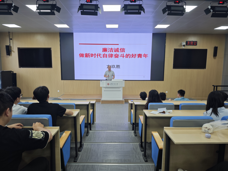 方玖胜以“廉洁诚信 做新时代自律奋斗的好青年”为题,为毕业生带来一堂廉洁教育微课。他从廉洁的内涵出发,结合古今廉洁典范故事与现实案例,深入剖析廉洁诚信的重要性,将廉洁理念从宏观社会层面延伸至学生的日常学习与未来职业发展中。他指出,学术研究中的数据造假、考试中的舞弊行为,以及未来职场中的利益输送,都与廉洁诚信背道而驰。他勉励,毕业生在人生新征程中,要始终坚守廉洁底线,以诚信为帆,做自律奋斗的新时代青年。他强调,文明离校是大学生思想政治教育工作的重要一环,也是学校人才培养的关键节点。学院始终将文明离校和爱校教育贯穿毕业生思想教育全过程,通过强化理想信念教育、安全教育、感恩教育,帮助毕业生树立正确的离校观念。他希望,毕业生们能站好大学时光的“最后一班岗”,遵守校规校纪,爱护校园环境,以文明有序的方式告别母校,为学弟学妹树立良好榜样。他鼓励,毕业生将个人理想融入国家发展,在新时代浪潮中砥砺前行,实现人生价值。