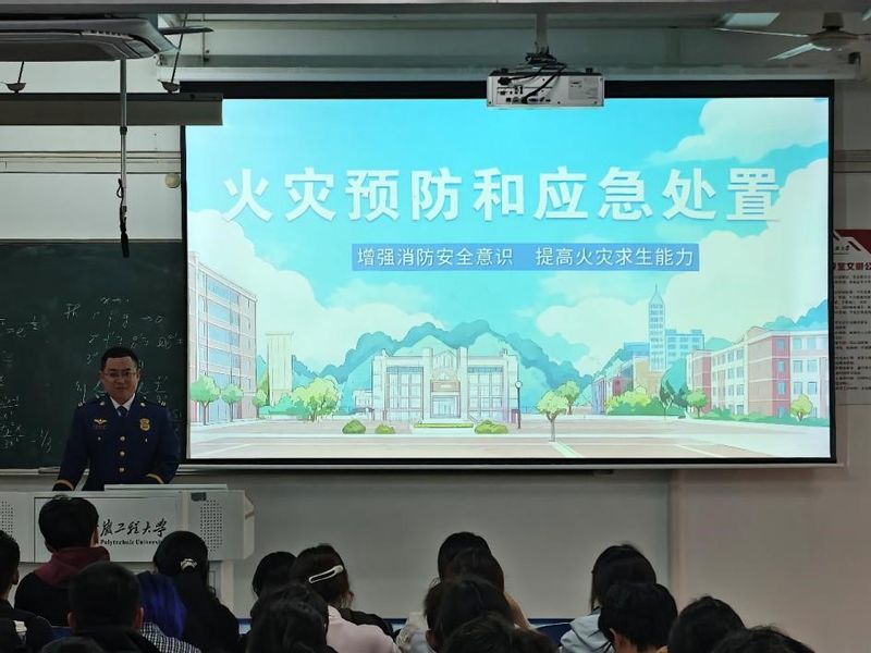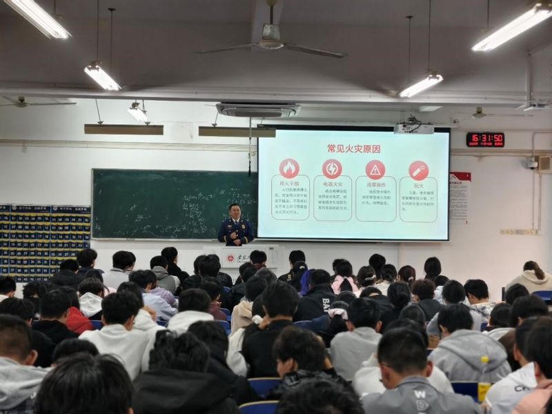授课中,王茂军围绕消防常识、火灾应对、器材使用、重点场所防护四大板块展开。他结合真实案例分析电器过载、实验操作不当等常见火灾诱因,用“燃烧三要素”理论解读火灾发生逻辑,明确火灾中致险关键因素;详细演示规范报警流程,强调地点、火势、被困人员等核心信息,解析五大逃生误区,讲解隔离、窒息、冷却等灭火原理;详细讲解干粉灭火器“提、拔、握、压”使用要领,解读常见消防标识含义。针对校园场景,他重点强调教室、实验室、宿舍、图书馆等场所的火灾预防措施,明确化学品管理、大功率电器使用规范及“人走电断”的安全要求。