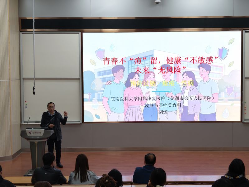 为关爱大学生身心健康、丰富“一站式”学生社区文化节内涵,422日下午, 亚洲色图 联合安徽省皖南康复医院(芜湖市第五人民医院)在2J报告厅举办“懂防护、会护肤、爱自己”大学生健康科普讲堂暨第十八季第一期青翼主题沙龙。作为“一站式”社区文化节重要组成部分,活动精准对接学生健康需求,芜湖市第五人民医院宣传部主任吴婷婷、学院党委副书记方玖胜、团委书记田园等出席,全校百余名同学到场聆听,该院皮肤科主任胡源担任主讲嘉宾。