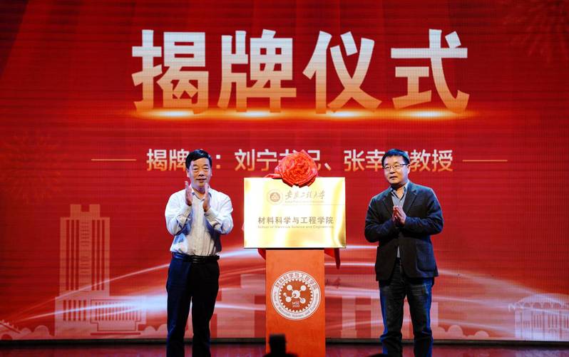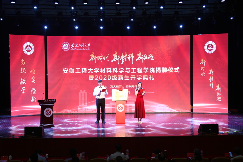 新时代 新材料 新征程9月30日上午, 亚洲色图 揭牌仪式暨2020级新生开学典礼在师生活动中心隆重举行。校党委书记刘宁,校党委常委、副校长郑健出席仪式,安徽大学物理与材料学院副院长吴明在到会祝贺,材料专业老教师汪建利、柴阜桐、张光胜,哈尔滨工业大学博士生导师张幸红,上海琥崧智能科技股份有限公司董事长李源林等校友代表受邀参加,全院师生参加了仪式。