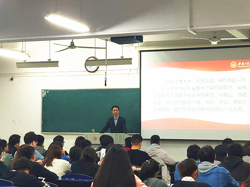 刘德军从习近平总书记安徽考察的行程讲起,结合每个考察地的实际情况,深入地解析习近平总书记在各地作出的重要讲话指示精神,让同学们有了更加清晰的了解。本次考察期间,总书记先后来到阜阳市、马鞍山市和合肥市,全方位的了解了各地经济、文化、生态、科技等发展情况,亲切的与乡亲们交流,了解他们生活中的状况和需求,始终将人民群众的利益摆在第一位。习近平总书记考察安徽重要讲话指示的核心内容可以概括为“两个坚持,两个更大”:坚持改革开放,坚持高质量发展;在新发展格局中实现更大作为,为加快建设美好安徽上取得新的更大进展。报告中指出,要在聚焦安徽“重点任务”上,将贯彻习近平总书记考察安徽重要讲话指示精神推深做实。我们要勤力同心、锐意进取,坚定不移强化“两个坚持”,乘势而上实现“两个更大”,为全面建成小康社会、开启全面建设社会主义现代化国家新征程提供科技支撑、人才支撑作出更大贡献!