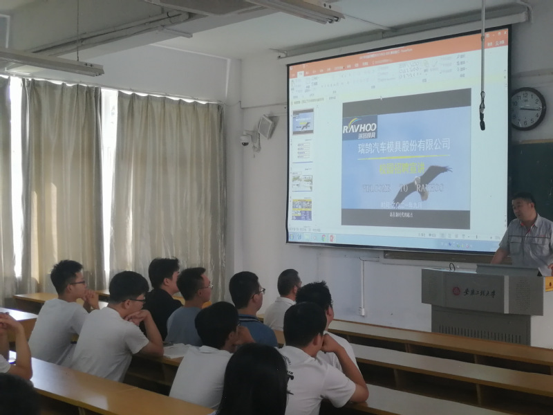 瑞鹄汽车模具有限公司主营业务为汽车冲压模具、检具及焊装自动化生产线的开发、设计、制造和销售,为国内少数能够同时为客户提供完整的汽车白车身高端制造装备、智能制造技术及整体解决方案的企业之一,在覆盖件模具、铝板件模具及铝车身焊接方面位居国内前列。招聘会现场,公司设计部部长任效王以校友的身份与同学们交流了模具设计的重要性以及从业人员应该具备的知识储备与技能。人事部经理袁媛通过播放宣传片和PPT演示的形式向同学们详细介绍了公司概况、招聘岗位及要求、职业发展路径、设计工程师培养流程、公司薪资福利体系,并进行了交流答疑,同时欢迎同学们前往公司实地考察了解情况。