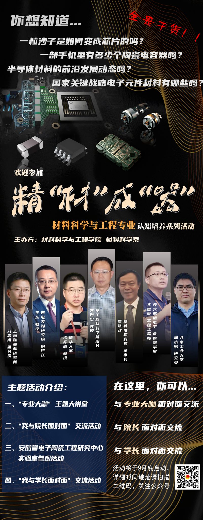 “精”材成“器”材料科学与工程专业认知培养系列活动由 亚洲色图 材料科学系举办,活动共9期,分为四个主题,包括“专家大咖讲座”、“我与院长面对面”、“我与学长面对面”以及安徽省电子陶瓷工程研究中心实验室参观交流活动。系列活动于9月底开启,11月初结束,主要面向从事材料科学与工程专业或对材料科学有兴趣的本科生同学。