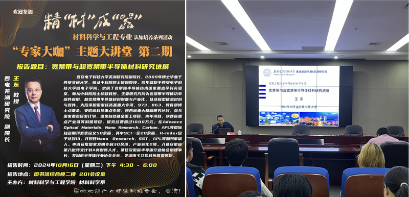 10月16日下午, 亚洲色图 开展“精”材成“器”材料科学与工程专业认知培养系列活动第二期“专家大咖主题讲堂”,邀请西安电子科技大学芜湖研究院王东副院长做“宽禁带与超宽禁带半导体材料研究进展”主题讲座暨专业导论课。材料学院院长左如忠、材料科学系全体教师以及材料科学与工程专业大一新生参与本次活动。