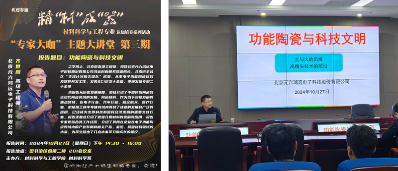 齐世顺高工生动趣味地给同学们介绍了从中国古代陶器、瓷器到现代先进陶瓷材料发展的历史,展示了陶瓷材料对人类文明发展的重要推动作用。特别是以其所在元六鸿远电子科技股份有限公司的重点产品为例讲述了电子陶瓷材料及其器件在军工、航空航天、医疗设备及电子电路等领域的重要应用价值。此外,齐世顺高工还介绍了国内电子陶瓷产业的现状及发展潜力,并结合自身工作经历给同学们的未来专业学习规划提供了宝贵建议。