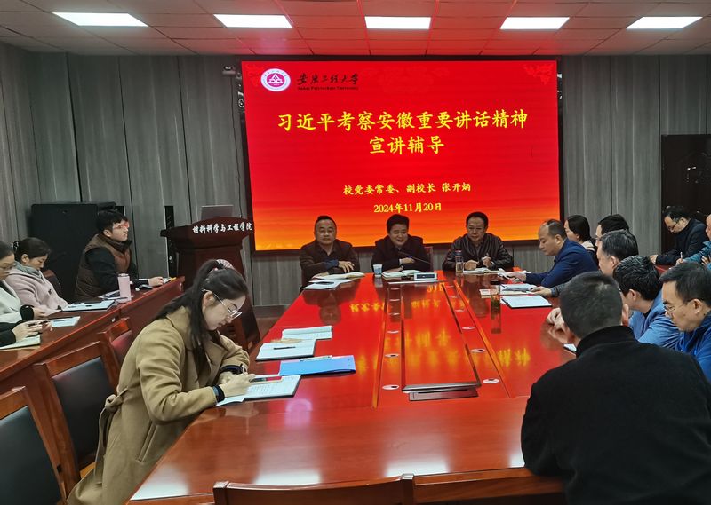 张开炳指出,学习贯彻习近平总书记重要讲话精神是当前和今后一个时期的重大政治任务,学校党委对宣传宣讲工作作出部署安排,作为联系点校领导,来到学院集中宣讲解读,最重要的目的是引导全体教职工把思想和行动统一到习近平总书记重要讲话精神上来,自觉弘扬中华优秀传统文化、自觉投身科技强国建设,为落实立德树人根本任务、推动学校高质量内涵式发展贡献力量。他强调,习近平总书记对安徽提出“发挥多重国家发展战略叠加优势”的嘱托,长三角一体化发展、长江经济带、中部地区崛起、高质量共建“一带一路”等国家重大发展战略是重要的机遇,作为省属重点工科院校,特别是具有传统专业优势和未来发展优势的学院,要带头深入抓好学习宣传贯彻,结合实际谋划具体的落实举措。接着,他从学院历史、现状两个维度,用“新材料、硬支撑、新气象、新机遇、新挑战”五个关键词对学院的建设发展进行了分析、发展成绩予以肯定;他从“增强党组织凝聚力、学科凝聚力、情怀凝聚力”等三个方面对学院的进一步发展进行指导,希望学院党政班子、全体教职工认真学习贯彻习近平总书记考察安徽重要讲话精神,对标学校党政决策部署、学生成长成才目标、家长社会期待,主动出击、汇聚资源、发掘动能,推进学院发展再上新台阶。