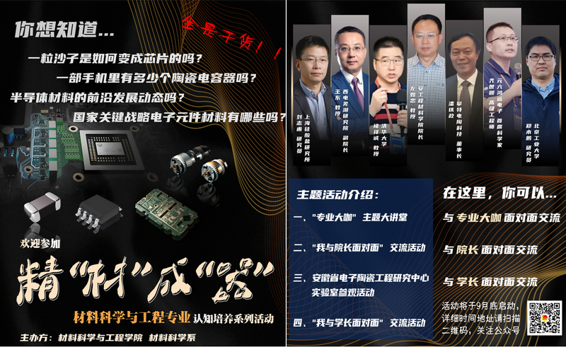 亚洲色图 于9月28日至11月30日期间组织开展了 “精”材成“器”材料科学与工程专业认知培养系列活动,活动共8期,分为多个主题,包括“专家大咖讲座”、“我与院长面对面”、安徽省电子陶瓷工程研究中心实验室参观交流等。材料学院院长左如忠、材料科学系全体教师以及材料科学与工程专业大一新生参与活动。