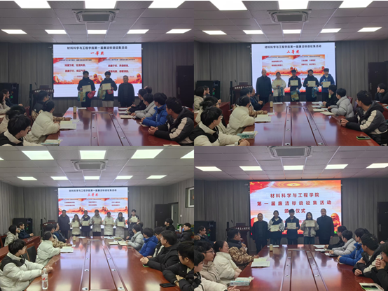 方玖胜宣读了学院第一届廉洁标语征集活动评选结果。与会领导为优秀组织奖和个人优秀作品奖获得者颁发荣誉证书和奖品。