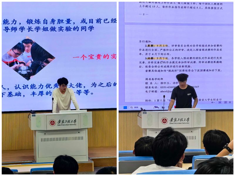 鲍俊杰围绕安徽省大学生创业计划竞赛展开系统性讲解。他结合PPT演示,逐一拆解了比赛要求中的核心指标:“项目需聚焦真实社会问题,如我们的‘可降解海洋污染吸附材料’就锚定环保痛点。在选题阶段,建议通过SWOT分析筛选既有创新空间又具备转化潜力的方向,并展示了一份逻辑严密的商业计划书模板。”江怀林则从竞赛准备和竞赛过程展开了分享,详细介绍了团队组建、资料收集与分析,并分享了撰写技巧和路演环节中的注意事项;另外从报名流程和注意事项等,强调研读比赛通知和规则的重要性。